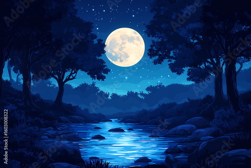 Fototapeta premium Mysterious enchanting landscape, river illuminated by moonlight on full moon. Mysterious trees grow along riverbank, mystical atmosphere. Background, banner or backdrop for Halloween, enigmatic themes