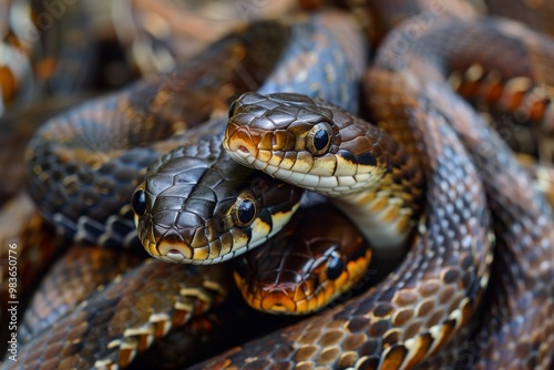© InfiniteStudio, Fototapeta premium Mysterious encounter of snakes coiled together in the wild with heads facing each other in their natural habitat