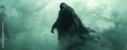 Obraz premium Mysterious figure emerges from fog dark forest fantasy illustration eerie...