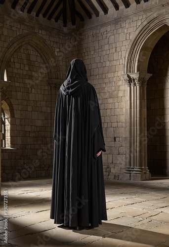 Naklejka premium Mysterious figure in a dark cloak stands in a medieval stone setting, evoking...