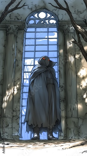 Naklejka premium Mysterious Figure in Abandoned Hall