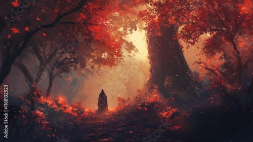 Obraz premium Mysterious figure in an enchanted forest with autumn foliage. Concept of fantasy and adventure.