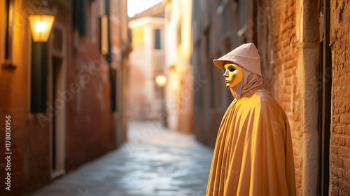 © Nazlykhan, Naklejka premium Mysterious figure in cloak and mask at dusk in a european alley