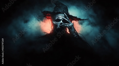 Fototapeta premium Mysterious figure in dark, hooded cloak with an eerie atmosphere.