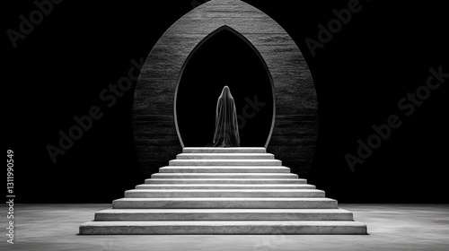 Fototapeta premium Mysterious Figure in Dark Space with Archway and Steps Leading to an Unknown Destination