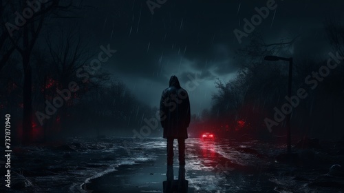 Fototapeta premium Mysterious Figure in Rainy Forest - Dark, Moody Atmosphere with Red Accents