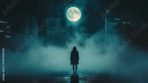 © Terablete, Fototapeta premium Mysterious figure stands atop a building overlooking a foggy city under a bright full moon at night