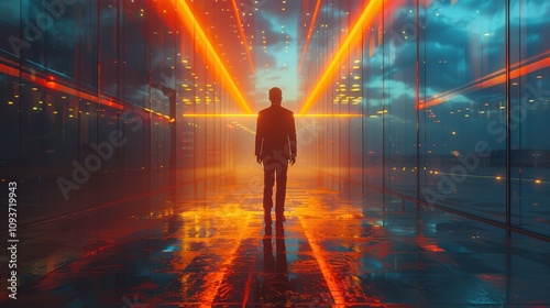 Obraz premium Mysterious figure walking through a futuristic corridor illuminated by...