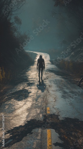© Murda, Obraz premium Mysterious figure walks down foggy winding road