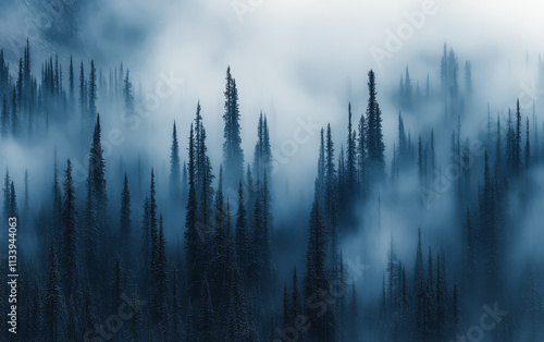 © JuanM, Obraz premium Mysterious fog envelops a dense forest with tall pine trees in twilight