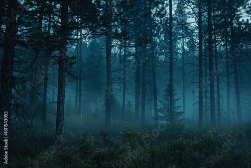 © nsit0108, Obraz premium Mysterious fog rolling through a dark forest at night, creating a spooky atmosphere