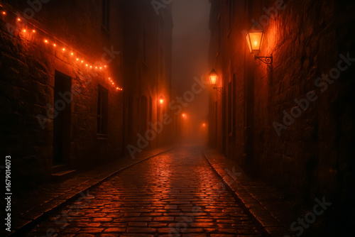 Obraz premium Mysterious foggy alley illuminated by orange street lamps
