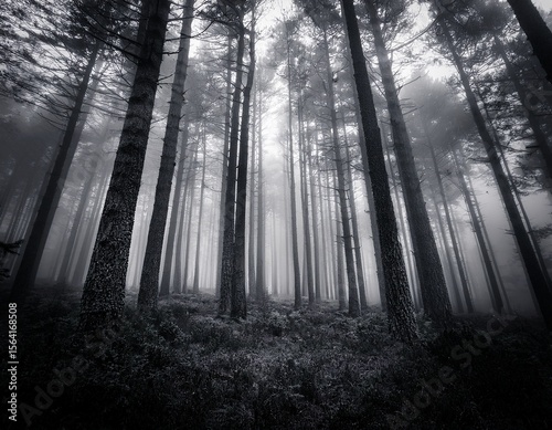 © Dusty, Fototapeta premium mysterious foggy black and white forest with tall trees and fading perspective perfect for nature themes horror stories calm atmosphere or conceptual photography
