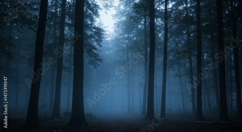 Fototapeta premium Mysterious foggy forest at dusk with tall trees and misty atmosphere