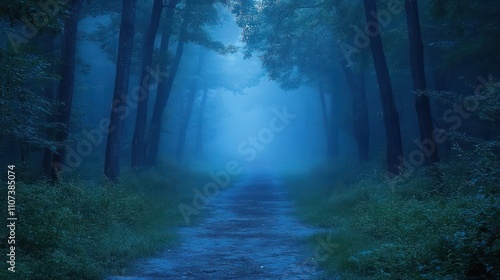 Fototapeta premium Mysterious foggy forest path at twilight.