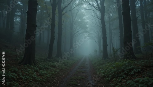 Obraz premium Mysterious foggy forest path serene nature scene gigapixelcgi tranquil...