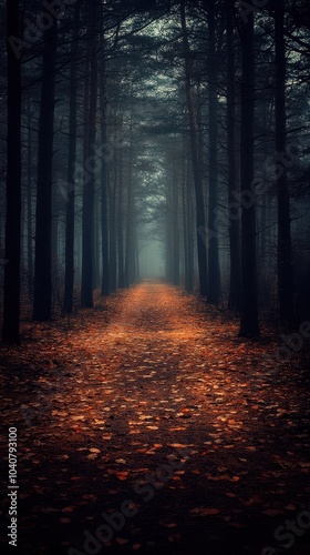 Fototapeta premium Mysterious Foggy Forest Path with Fallen Leaves