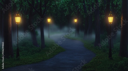 © Freedom in Life, Obraz premium Mysterious Foggy Forest Path with Glowing Lamps at Night