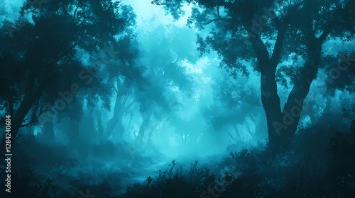 © Thiago, Fototapeta premium Mysterious foggy forest with a magical blue glow illuminating the trees. magical forest whispers. illustration. Misty Forest of Whispers. Illustration