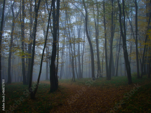 © Jansk, Fototapeta premium Mysterious foggy forest with forest path during autumn day