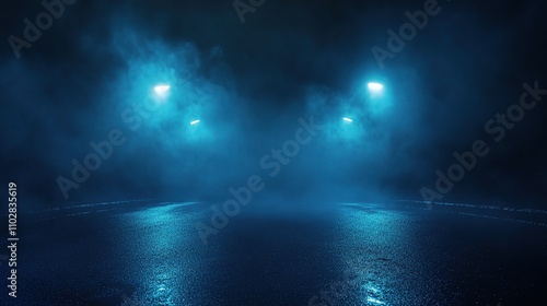 Fototapeta premium Mysterious Foggy Night with Blue Lights in Urban Environment