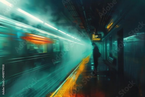 © Bijac, Fototapeta premium mysterious foggy subway platform with blurred commuter and rushing train digital painting