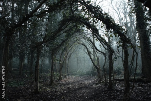 Naklejka premium Mysterious Forest Path - A Dark and Eerie Landscape.