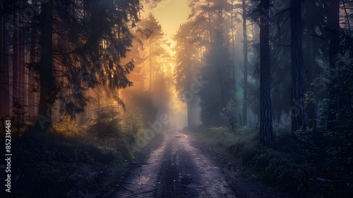 © Trukune, Fototapeta premium Mysterious Forest Path at Sunrise