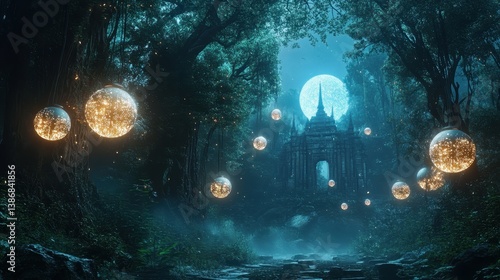 Naklejka premium Mysterious forest path illuminated by glowing orbs leading to an ancient...