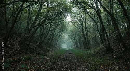 Naklejka premium Mysterious Forest Path Leading Into Ethereal Fog on a Dim and Tranquil Day