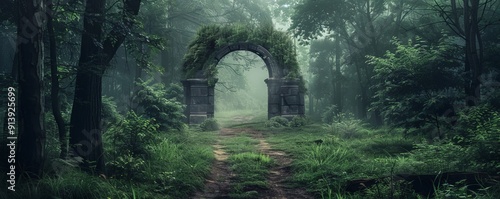 © Coosh448, Obraz premium Mysterious forest path leading to a hidden clearing with ancient ruins, 4K hyperrealistic photo