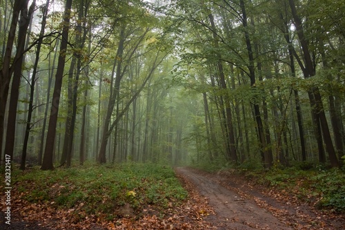 © Valeronio, Naklejka premium mysterious forest road on a misty autumn morning, typical foggy October weather, yellow wet fallen leaves on the ground, eco tourism active rest concept