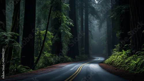 Fototapeta premium Mysterious Forest Road Winding Through Tall Trees and Lush Greenery with a Misty Atmosphere. Generative AI