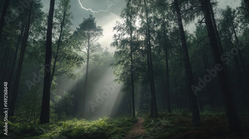 Obraz premium Mysterious forest scene with dramatic light and shadows in the trees under stormy skies