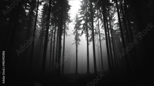Obraz premium Mysterious forest shrouded in mist, capturing an eerie yet tranquil atmosphere with towering trees and soft light.