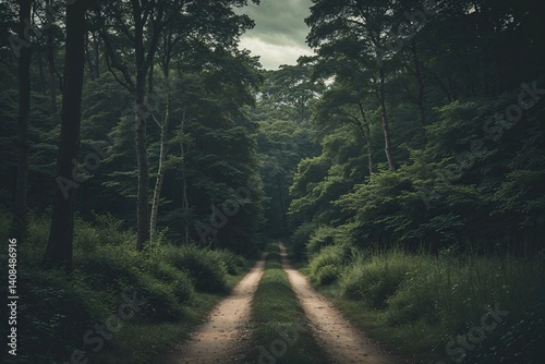 © Michael, Fototapeta premium Mysterious Forest Trail Surrounded by Lush Green Trees in Vintage Natural Setting