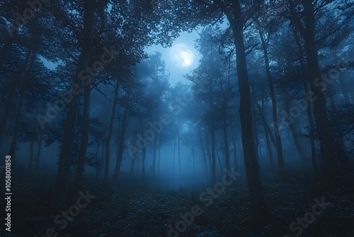 Obraz premium Mysterious forest under moonlight on a foggy night in autumn