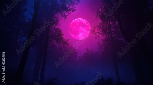 Fototapeta premium Mysterious forest with a vibrant pink moon illuminating the foggy trees.