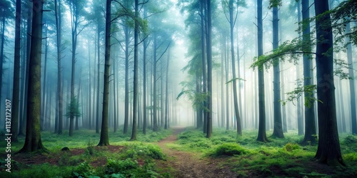 Naklejka premium Mysterious forest with dense fog and tall trees, nature, mist, woods, eerie,...