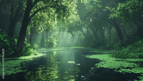 Fototapeta premium Mysterious Forest with Sunlight Filtering Through Trees