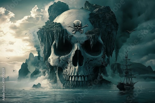 Fototapeta premium Mysterious ghost island features a giant pirate skull.