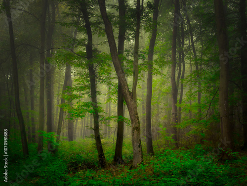 © Jansk, Fototapeta premium Mysterious green foggy forest during autumn day with trees