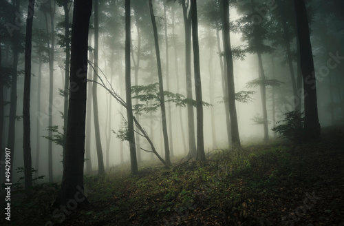 © andreiuc88, Fototapeta premium mysterious green forest in fog
