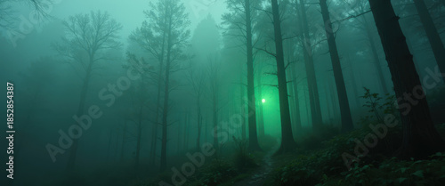 © Paozaa, Naklejka premium Mysterious green light illuminates foggy forest trail enigmatic nature scene serene atmosphere enchanted landscape