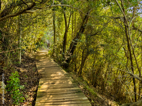 © Sunshine Seeds, Obraz premium Mysterious hiking trail path through dense mountain forest