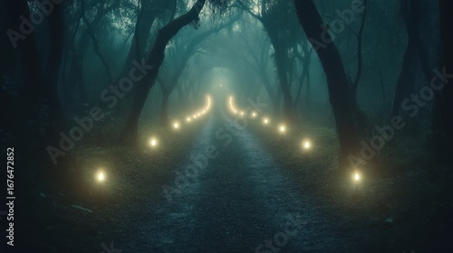 © Izza, Obraz premium Mysterious illuminated pathway through a dark forest creating an enchanting atmosphere
