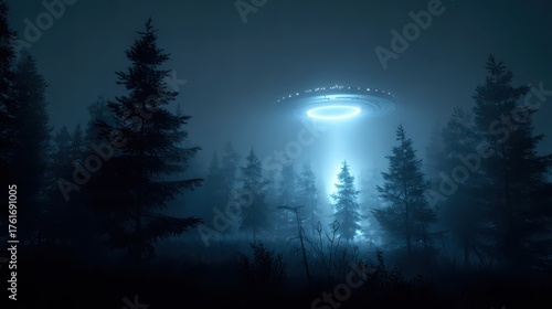 © Tanu, Fototapeta premium Mysterious lights illuminate a dark forest at night in an eerie alien encounter scene