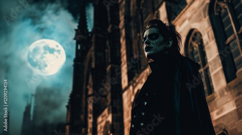 © Kenny, Naklejka premium Mysterious male with face paint near gothic cathedral at night with full moon