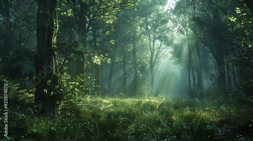 Obraz premium mysterious misty forest with sunbeams filtering through tall trees
