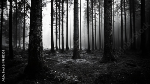 Naklejka premium Mysterious Monochrome Forest with Towering Trees in Foggy Setting :...
